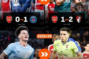 在接近1年的时间里,阿森纳首次在各项赛事中遭遇连败。2024-25赛季,阿森纳曾在面对巴黎圣日耳曼和伯恩茅斯时遭遇连败,分别以0-1和1-2的比分不敌对手。
