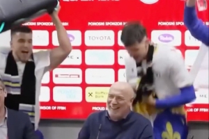 波黑球员带着音响闯入赛后发布会,庆祝球队晋级世界杯